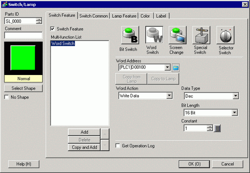 Create a switch to change languages. From the [Parts (P)] menu, point to [Switch Lamp (C)] and select [Word Switch (W)] or click