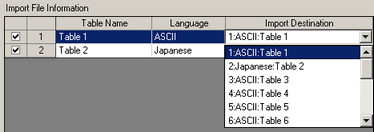 The [Table Name] and [Language] of the file to import are displayed. Select the check box to the left of the table name to import the table. Clear the check boxes next to tables you do not want to import. The imported Text Tables overwrite any existing tables in the project file.