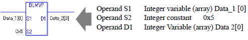 The BLMV and BLMVP instructions are block transfer instructions. When the BLMV instruction is executed, the number of data elements indicated in S2 are copied from S1 to D1. The BLMV and BLMVP instructions always pass power. When using the BLMV and BLMVP instructions, if the variables specified in operands S1 and D1 are not the same type, an error will occur. Designate the same variable type in operands S1 and D1.