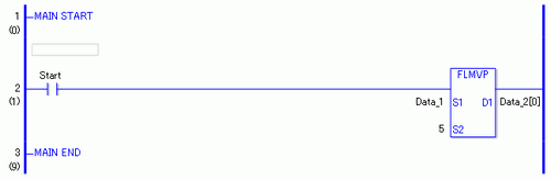 When the normally open instruction turns ON, the FLMVP instruction will be executed. When the FLMVP instruction is executed, data 1, stored in D1, is copied to elements 0 through 4 in data 2.