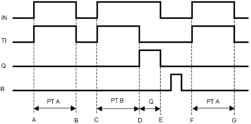 The timer input bit IN turns ON and the timer measurement bit TI turns ON. The timer measurement starts again and the elapsed time ET is added to the kept value. The timer output bit Q remains OFF.