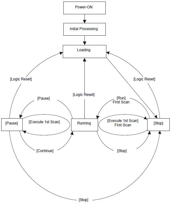 The logic is in the paused state. Upon receiving a command ([Logic Reset], [Run], [Single Scan], [Continue], or [Pause]), the state will change accordingly.