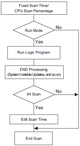 The scan time is adjusted every 64 scans. The scan times for the fixed scan time mode and CPU scan percentage mode are as follows.