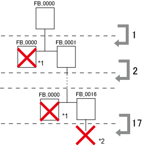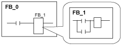 Using a Function Block (FB) within another FB's program is called "nesting FBs." You can nest FBs up to 16 levels. However, you cannot use recursive calls (using an FB as an instruction within the same FB).