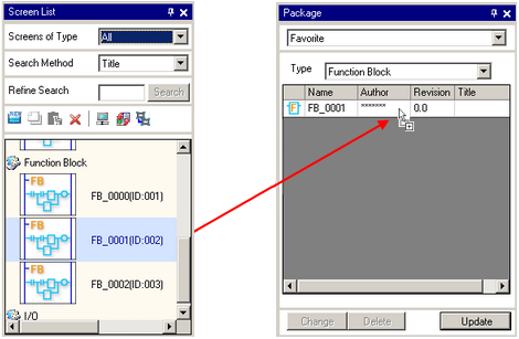 Select the Function Block you want to register in the package in the [Screen List] window, and drag and drop it to the Package.