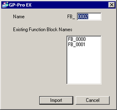 In the dialog box shown below, change the name of FB and click [Import]. You can check the names of all FBs registered in the Screen List in a list view.