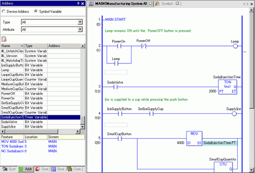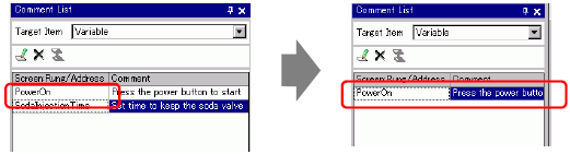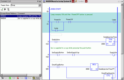 Use the [Comment List] to view variable, symbol, system variable, and rung comments in the logic program.