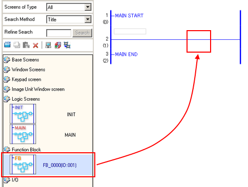 Open the [Screen List] window and select the FB you want to insert in the logic program.