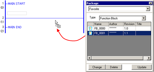 You can insert FBs registered in a package by dragging and dropping them to the Logic Screen.