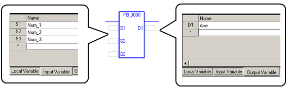 The values stored in the addresses or variables set for S operands are passed to input variables, and used in FBs. The values of output variables in FBs are stored in the addresses or variables set for D operands.