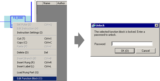 By setting a password for a Function Block (FB), you can restrict browsing and modification of programs. Setting a password turns an FB into a black box, allowing you to keep it confidential, while you can still reuse them.