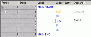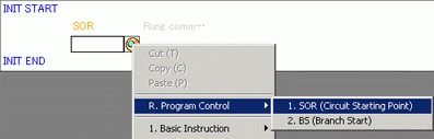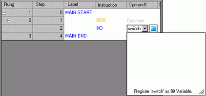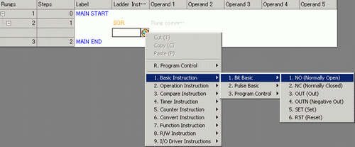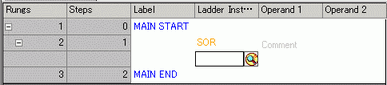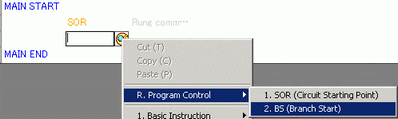 . An SOR (Circuit Starting Point) is inserted into the rung next to the MAIN START, and then a box for adding an instruction is displayed.