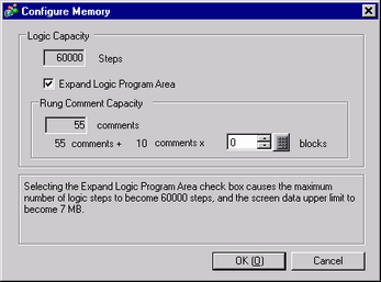 If you select [Expand Logic Program Area], the upper limit of the number of steps changes from 15000 to 60000. (The upper limit of the screen data will decrease by 1 MB.)