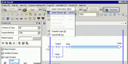 Select the point where you want to insert a branch and click [Insert Branch (B)] on the [Logic (L)] menu.