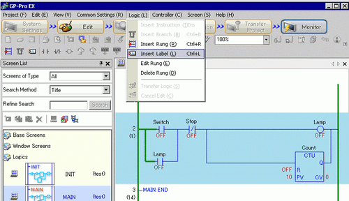 A label is inserted one down from the rung you select. to insert, select a rung when online monitor is on, and click [Insert Label (L)] on the [Logic (L)] menu.