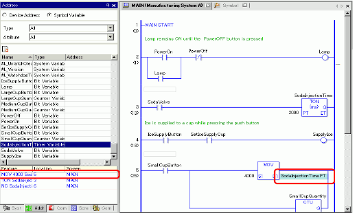 When [Target Item] is [Variable] or [System Variable], double-click the cell in the [Screen Rung/Address] column. This displays the [Address] window and selects the relevant symbol variable or system variable.
