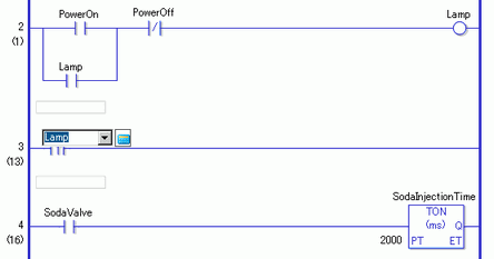Insert a PT instruction on the third rung (Positive Transition) and assign the symbol variable (Lamp) to the PT instruction.