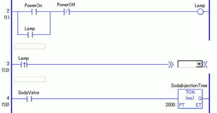 Here, for example, a subroutine [SUB-01] is executed when the OUT instruction (Lamp) on the second rung turns on. The JSR instruction is inserted in the 3rd rung.