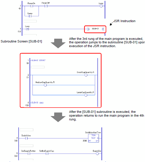 When the "Lamp" ON is detected, the operation jumps to the subroutine program [SUB-01]. After the subroutine program [SUB-01] is executed, the main logic program [MAIN] resumes on the fourth rung.
