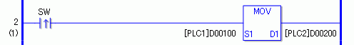 When turning on the bit that initiates the write operation, data in [PLC1]D0100 is stored in [PLC2]D0200.