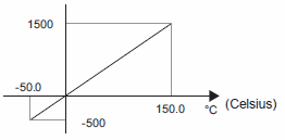 The displayed value (-500 to 1500) is 10 times the input value ranging from -50.0°C to 150.0°C.