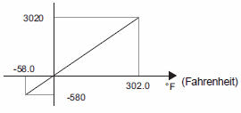 The displayed value (-580 to 3020) is 10 times the input value (-58.0°F to 302.0°F).