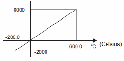 The displayed value (-2000 to 6000) is 10 times the input value ranging from -200.0°C to 600.0°C.