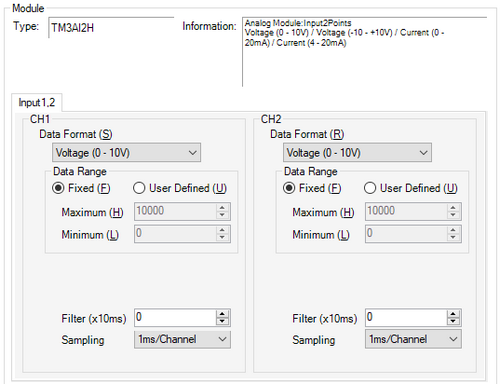 Select the sampling period for calculating the moving average of input values, from [1ms/Channel], [10ms/Channel], and [100ms/Channel]. The available sampling periods depend on the TM3 module used.