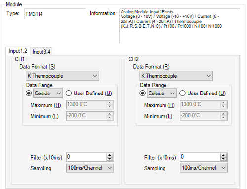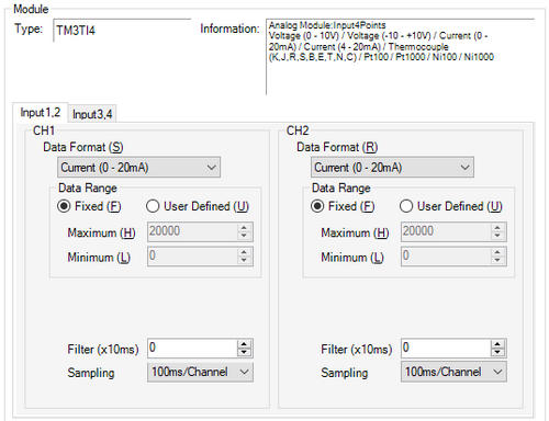 Select the sampling period for calculating the moving average of input values, from [1ms/Channel], [10ms/Channel], and [100ms/Channel]. The available sampling periods depend on the TM3 module used.