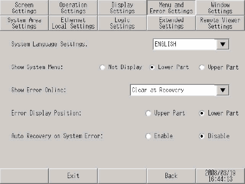 The [Menu and Error Settings] screen opens. In the [System Language Settings] touch