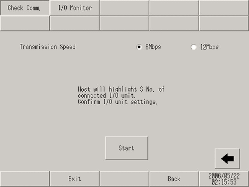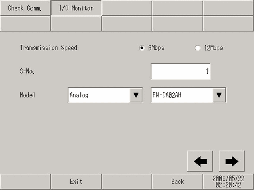 [I/O Monitor] screen opens. Set the [Transmission Speed], [S-No.], [Model], and [Type]. (Example: [S-No.] = 1, [Model] = Input, FN-AD02AH, [Transmission Speed] = 6 Mbps)