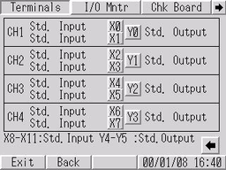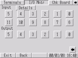 [I/O Monitor] screen opens. The corresponding bit numbers in [Input] are highlighted to match the ON/ OFF status of corresponding inputs from the connected device. [Output]: You can confirm the ON/ OFF status of each output by touching the corresponding bit number.