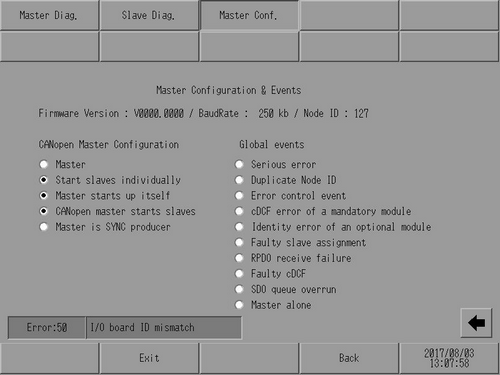 [Master Configuration & Events] screen opens. Use the lamps to confirm the network's [CANopen Master Configuration] and [Global events]. (For example, CANopen Master Configuration: [Master], [Start slaves individually], [Master starts up itself], [CANopen master starts slaves], and [Master is SYNC producer]. Global events: [Master alone] indicates that the slave cable is disconnected.)
