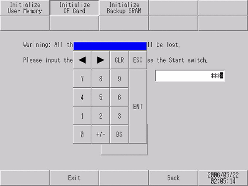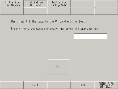 From the [Initialize CF Card] screen, touch the input field and type "1101" (when the [System Password] is [Disable]) or type the system password.