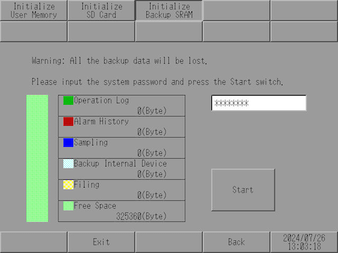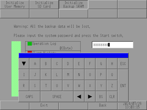 From the [Initialize Backup SRAM] screen, touch the input field and use the keypad to type "1101" (when the [System Password] is [Disable]) or type the defined system password.