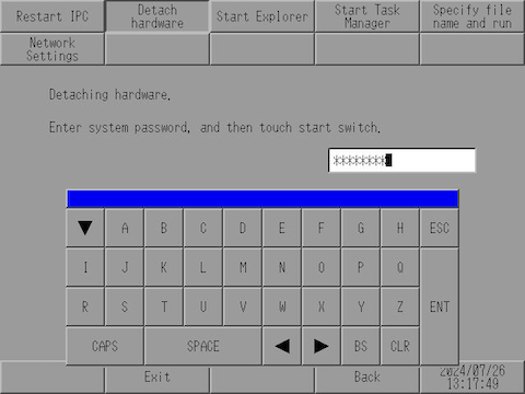 Touch the input field and use the keypad to enter "1101" (when [System Password]=[None]), or enter the password as defined in the [System Password] settings.