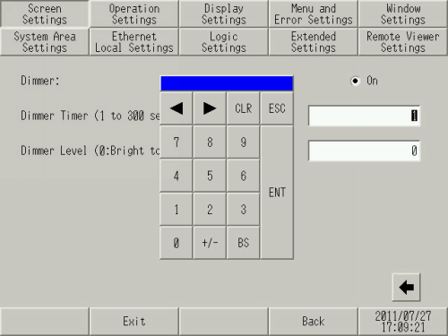 Touch the [Dimmer Timer (1 to 300 seconds)] field to display the tenkey pad. Enter the number of seconds from the last touch screen operation until the screen is dimmed. Touch the [ENT] key.