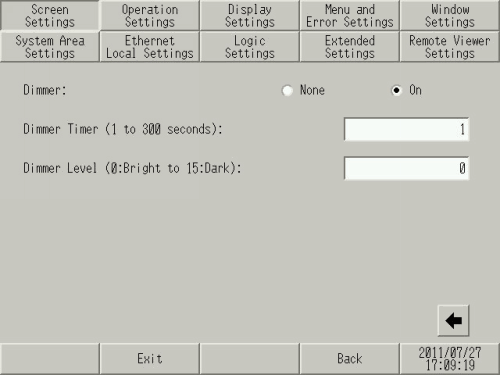 Touch the [Dimmer Level] field (0:Bright, 15:Dark) to display the tenkey pad. Enter the brightness level when the screen is dimmed and touch the [ENT] key.
