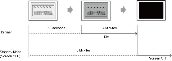 The screen is dimmed 60 seconds after the last touch screen operation, and enters standby mode (screen turns OFF) 4 minutes later.