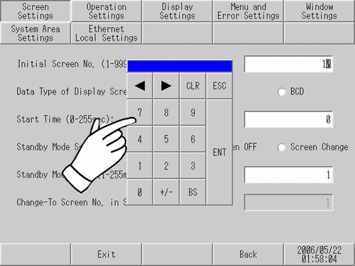 Touch the [Initial Screen No (1-9999)] field, and use the tenkey pad to type "10" and touch the [ENT] key.