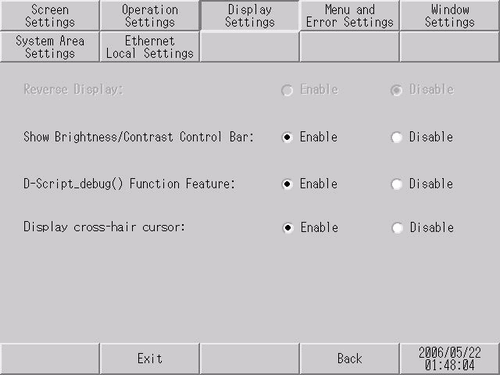 Specify whether to display the cross cursor. When the crosshairs cursor display is enabled, the crosshairs cursor appears at the touched position on the screen. You can check for a touch calibration error based on the difference between the crosshairs cursor position and the drawing position.