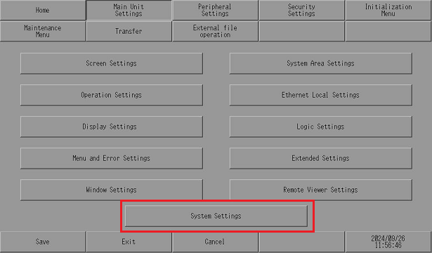 Touch the [System Settings] button to move to the System Settings. Set IP address, clock, or calibrate the touch panel. For more information, refer to the corresponding hardware manual