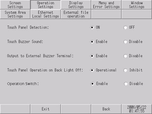 When the [Enable] option is selected, the display unit accepts input from the touch panel or function keys only while the Operation Switch (OP) is pressed.