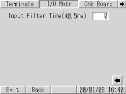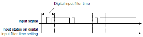 On the details setting screen, specify an input filter time in the range of 0 to 40. The input filter eliminates noise from an input signal. An input signal that does not reach the time duration specified here will not work. The system samples data at 0.5 ms intervals and stores the data internally, to verify the data by reading the input terminal status before the specified time at an I/O refresh interval of 2 ms. If the input terminal is always in the same state, this state is regarded as the value for the input terminal. If it is not in the same state, the previous value is regarded as the input value.