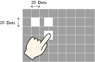 For display units with a matrix touch panel, the touched area shows a 20x20 pixel square. (touch coordinates are detected in 10 pixel increments)