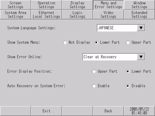 Set the system menu details and the display position of error messages.