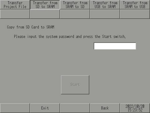 In offline mode, when you transfer from the CF/SD card to backup memory (SRAM), the values for [Brightness], [Contrast], and [Volume] do not change. Note, however, that when the display unit enters RUN mode or is turned OFF and then ON again, the transferred information is used in operations.