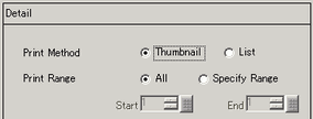 For [Thumbnail] in [Print Method], select the Print Range from [All] or [Specify Range]. For [Specify Range], specify the Range with mark numbers in [Start] and [End].