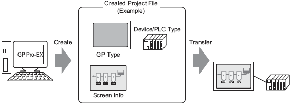 The project file merges information from created screens, display unit and model, device/PLC drivers, fonts and other settings.