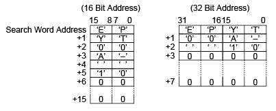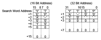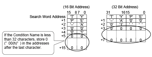 If the specified name is less than 32 characters, write 0 (NULL="0(h)") or a blank space ("20h") in all the addresses following the last character. Characters before the 0 (NULL) or space are considered part of the search condition.